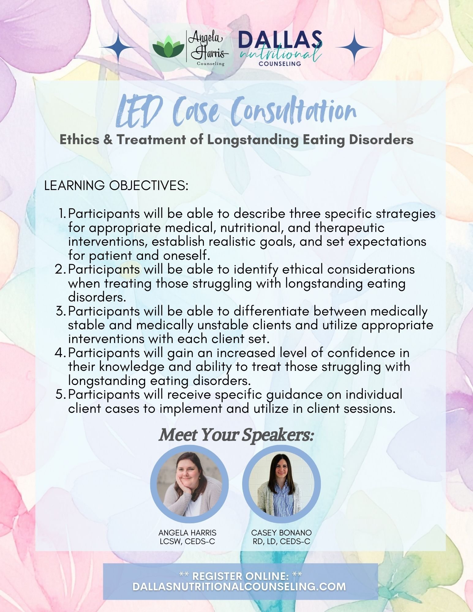 LED Case Consultation - Ethics & Treatment of Longstanding Eating Disorders, Dallas Nutritional Counseling & Angela Harris Counseling professional consultation and supervision for severe and enduring eating disorders